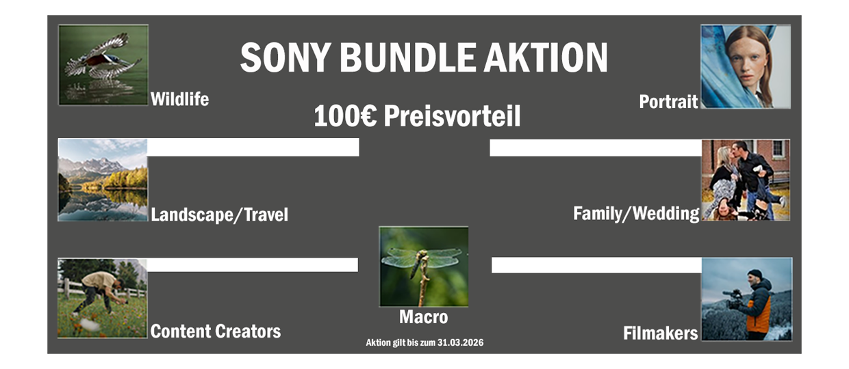 Aktionszeitraum: 01.04.2024 - 30.06.2026teilnehmende Aktionsartikelweitere InformationenKauft eine Sony Alpha Kamera und erhaltet nach Registrierung für den Kauf von bis zu drei ausgewählten Sony Objektiven jeweils 100 EUR Cashback.